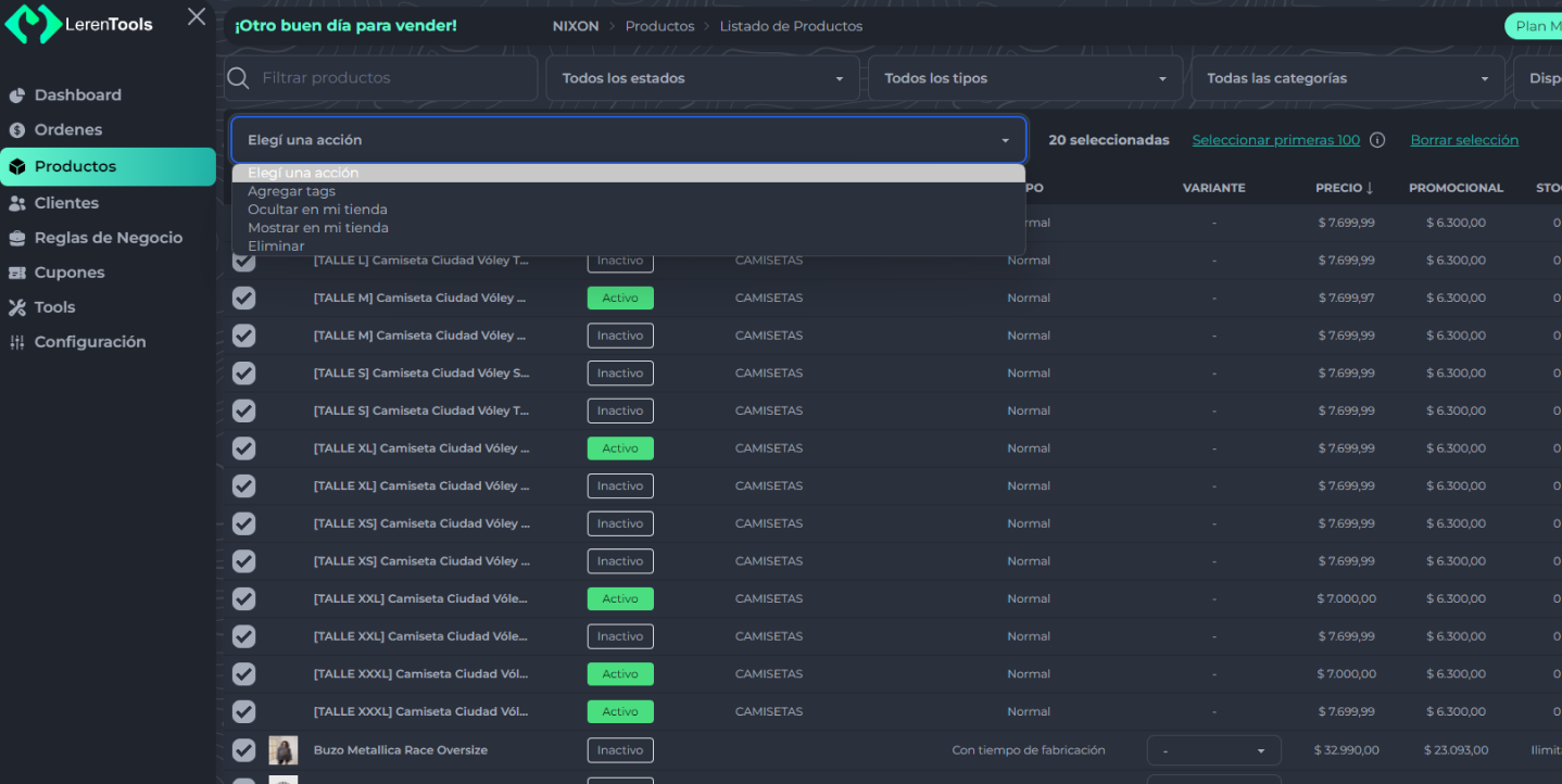 Nuestra nueva aplicación de acciones masivas con filtros avanzados ha sido diseñada para proporcionar una gestión eficiente y personalizada en tus operaciones diarias en Tiendanube.